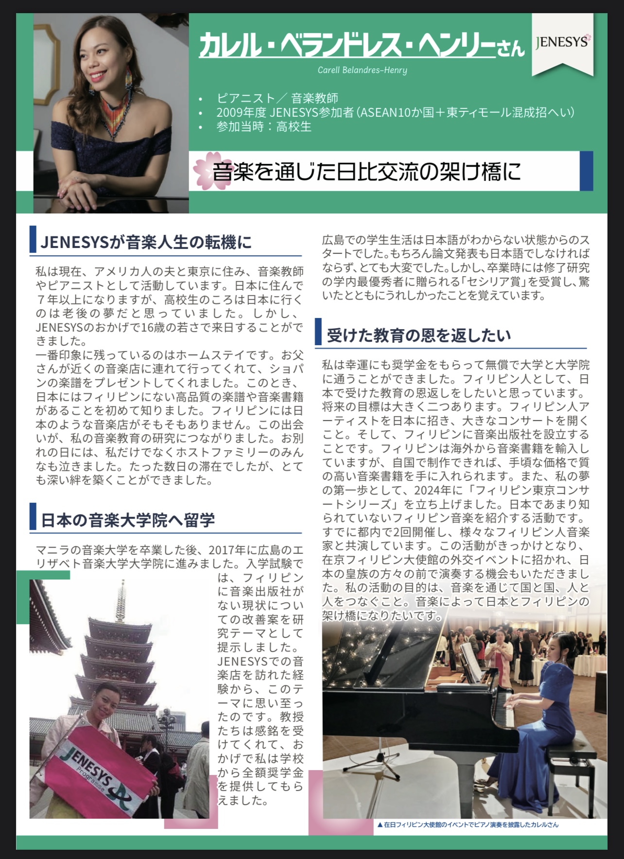 After graduating from St. Scholastica's College, Manila, School of Music, I went on to the Elisabeth University of Music Graduate School in Hiroshima in 2017. I passed the entrance exam. My student life in Hiroshima started without knowing Japanese. Of course, I had to present my thesis in Japanese, which was very difficult. However, I remember being surprised and happy when I received the Cecilia Award at graduation, which is given to the best student in the university for the completion of their research. I proposed a research topic on how to improve the current situation in the Philippines, where there are no music publishers. I came up with this topic after visiting a music store during the JENESYS program. The professors were impressed, and thanks to them, I was offered a full scholarship by the school.